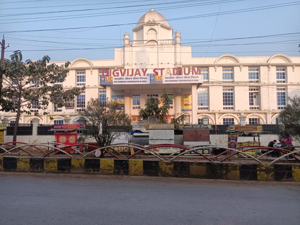 इस बोर्ड के ठीक नीचे भारतीय जीवन बीमा निगम का बोर्ड लगा दिया गया है। सिर्फ यहीं नहीं, इसके अगल बगल में भी भारतीय जीवन बीमा निगम का बोर्ड लगा दिया गया है। अगल-बगल में लगे बोर्ड तो फिर भी चल सकते हैं पर स्टेडियम के मुख्य द्वार जिसके ऊपर दिग्विजय स्टेडियम लिखा है, वहां से भारतीय जीवन बीमा निगम का बोर्ड निकालकर अन्यत्र लगाया जाना चाहिए। दिग्विजय स्टेडियम के ऊपर इसके अलावा और भी गुंबज बने हैं पर दिग्विजय स्टेडियम का बोर्ड इसी गुंबज में लगा है।